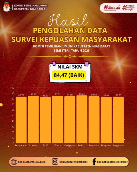 ???? Hasil Survei Kepuasan Masyarakat (SKM) Semester I Tahun 2025 KPU Kabupaten Nias Barat meraih nilai indeks 84,47 dengan kategori Baik.
