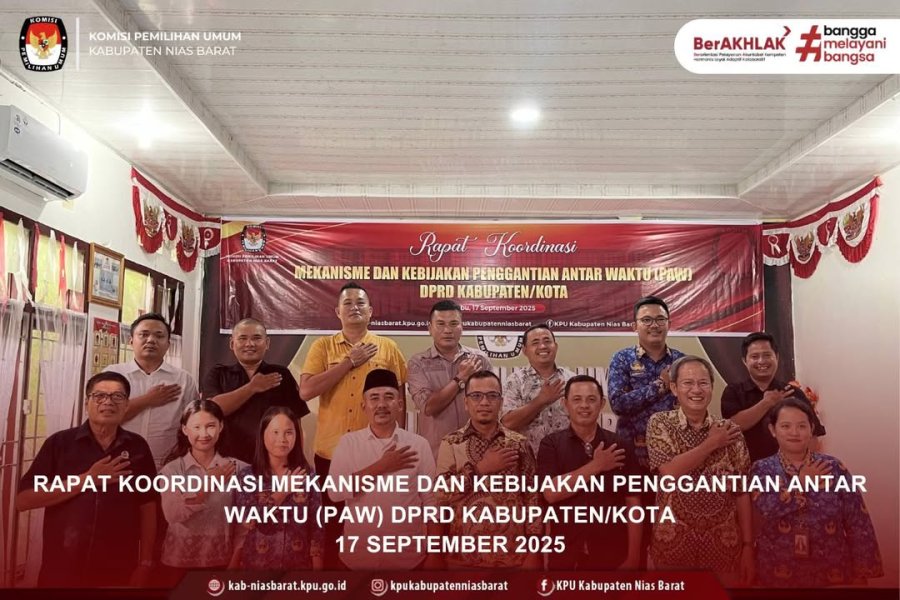 KPU Kabupaten Nias Barat melaksanakan Rapat Koordinasi Penggantian Antar Waktu (PAW) Anggota DPRD berdasarkan PKPU Nomor 6 Tahun 2019, bertempat di Aula Kantor KPU Kabupaten Nias Barat, Rabu (17/09/2025).