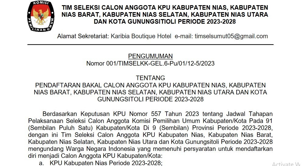 PENGUMUMAN BAKAL CALON ANGGOTA KPU KABUPATEN NIAS, NIAS BARAT, NIAS SELATAN, NIAS UTARA DAN KOTA GUNUNG SITOLI Rabu, 14 Juni 2023 00:00 1457 PENGUMUMAN Nomor 001/TIMSELKK-GEL.6-Pu/01/12-5/2023 TENTANG PENDAFTARAN BAKAL CALON ANGGOTA KPU KABUPATEN NIAS, KABUPATEN NIAS BARAT, KABUPATEN NIAS SELATAN, KABUPATEN NIAS UTARA DAN KOTA GUNUNGSITOLI PERIODE 2023-2028 SELENGKAPNYA...KLIK DI SINI Baca Selengkapnya