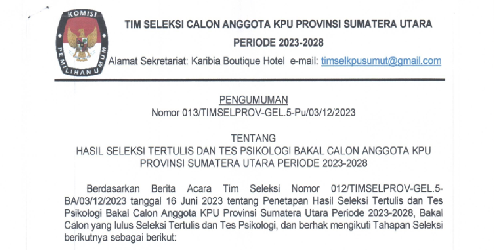 PENGUMUMAN HASIL SELEKSI TERTULIS DAN TES PSIKOLOGI BAKAL CALON ANGGOTA KPU PROVINSI SUMATERA UTARA PERIODE 2023-2028 Sabtu, 17 Juni 2023 00:00 1266 SELENGKAPNYA..... KLIK DI SINI Baca Selengkapnya