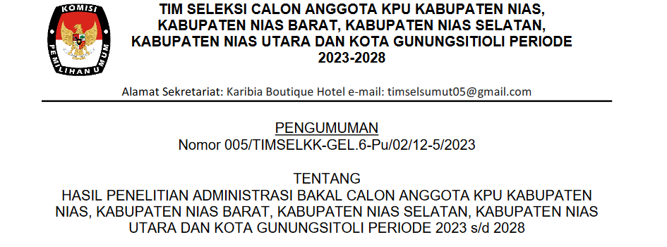 HASIL PENELITIAN ADMINISTRASI BAKAL CALON ANGGOTA KPU KABUPATEN NIAS, KABUPATEN NIAS BARAT, KABUPATEN NIAS SELATAN, KABUPATEN NIAS UTARA DAN KOTA GUNUNGSITOLI PERIODE 2023 s/d 2028 Selasa, 04 Juli 2023 19:00 1168 SELENGKAPNYA KLIK DI SINI Baca Selengkapnya