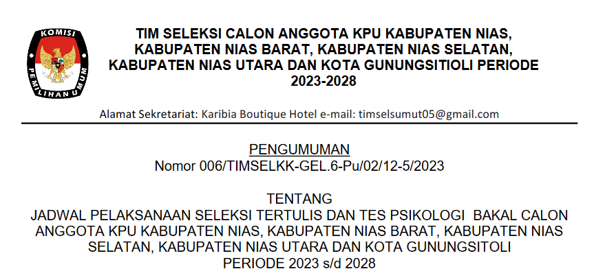 JADWAL PELAKSANAAN SELEKSI TERTULIS DAN TES PSIKOLOGI BAKAL CALON ANGGOTA KPU NIAS, NIAS BARAT, NIAS SELATAN,NIAS UTARA DAN GUNUNGSITOLI PERIODE 2023 s/d 2028 Kamis, 06 Juli 2023 07:00 1129 SELENGKAPNYA KLIK DI SINI Baca Selengkapnya