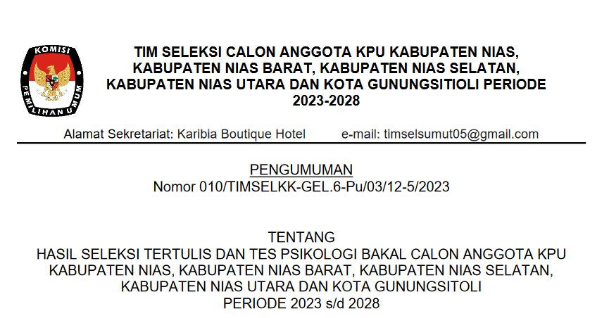 HASIL SELEKSI TERTULIS DAN TES PSIKOLOGI BAKAL CALON ANGGOTA KPU KABUPATEN NIAS, KABUPATEN NIAS BARAT, KABUPATEN NIAS SELATAN, KABUPATEN NIAS UTARA DAN KOTA GUNUNGSITOLI PERIODE 2023 s/d 2028 Selasa, 18 Juli 2023 07:00 1185 SELENGKAPNYA KLIK DI SINI Baca Selengkapnya