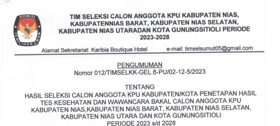HASIL SELEKSI CALON ANGGOTA KPU KABUPATEN NIAS, KABUPATEN NIAS BARAT, KABUPATEN NIAS UTARA , KABUPATEN NIAS SELTAN DAN KOTA GUNUNG SITOLI PERIODE 2023 s/d 2028 Sabtu, 29 Juli 2023 23:00 1597 SELENGKAPNYA KLIK DI SINI Baca Selengkapnya